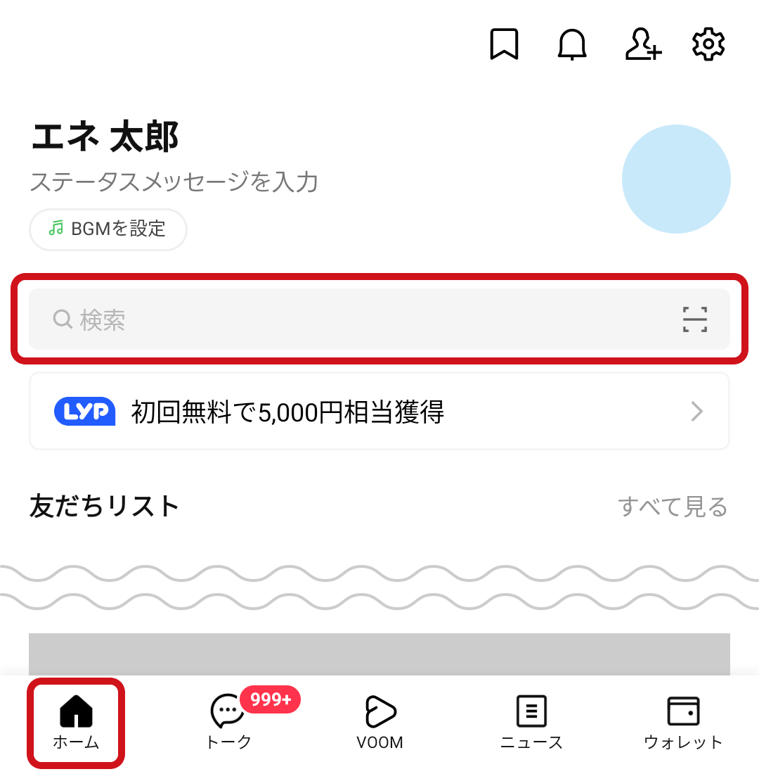 - 1. LINEアプリのホーム画面上部の検索枠をタップし、検索画面を開いてください。